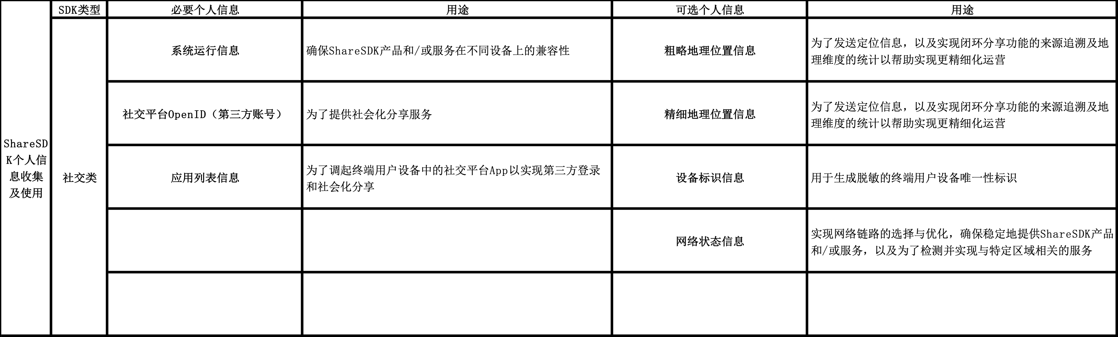 为了实现完整功能需要,本平台上的ShareSDK产品和/或服务在应用程序前后台都可能保持开启状态。在开启状态中,我们处理您和/或您的终端用户的信息的目的、处理方式、处理的个人信息的种类、处理规则如下:
